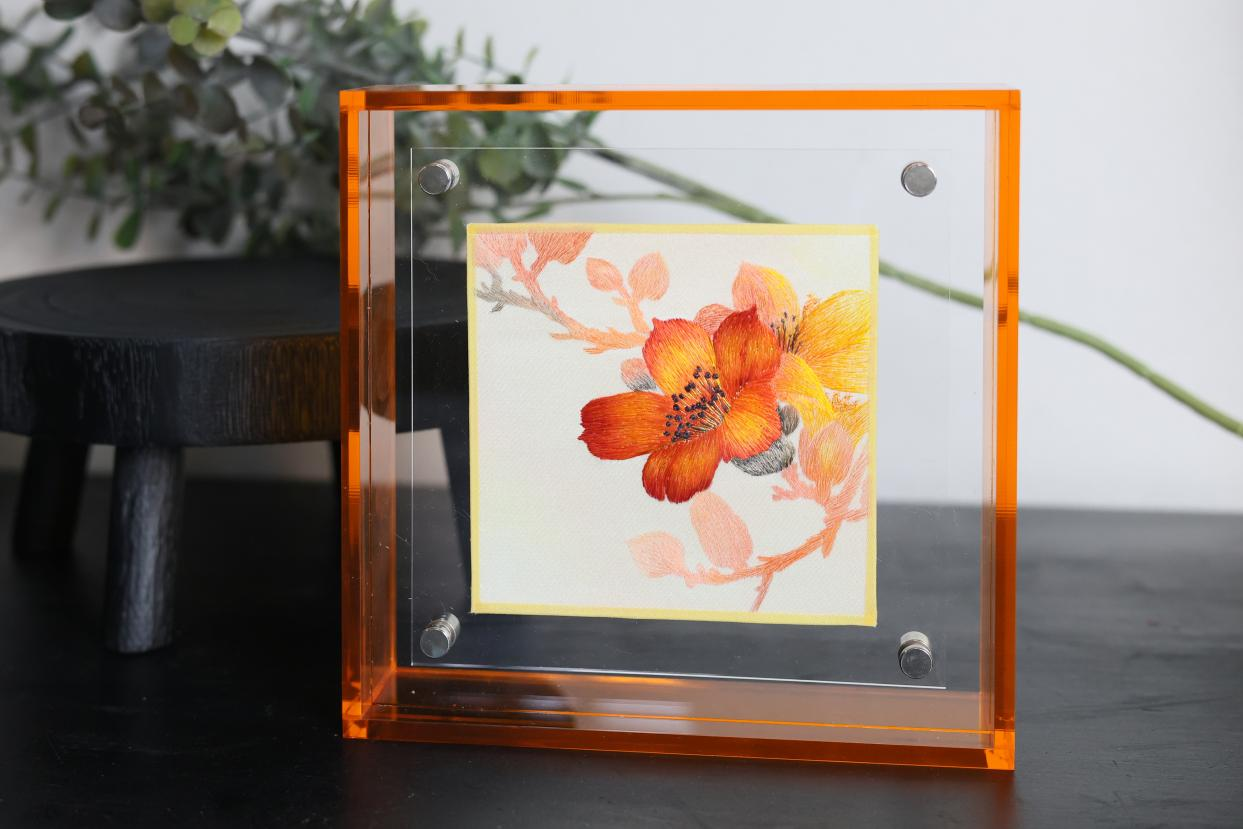 《湾区花开》系列深入挖掘粤港澳大湾区的文化底蕴与全运精神的时代内涵,以广东省花“木棉花”为核心创作元素,通过“金彩霞”湘绣非遗技艺进行创新演绎。《红棉华彩》刺绣摆件由潘妍工作室匠心呈现,精湛的刺绣工艺与现代感十足的亚克力外框相得益彰,巧妙呼应“窗口中的全运盛景”设计理念,宛如一扇展现湾区活力与全运激情的艺术视窗。《红棉花语》刺绣车挂传递出岭南英雄树般的奋发精神,寓意“一路繁花,驰骋全运”。《红棉绽放》刺绣项链由夏艳工作室精心打造,将湘绣的细腻工艺凝练于方寸之间,化作可随身佩戴的艺术品,象征“颈间盛放,锦绣同行”。