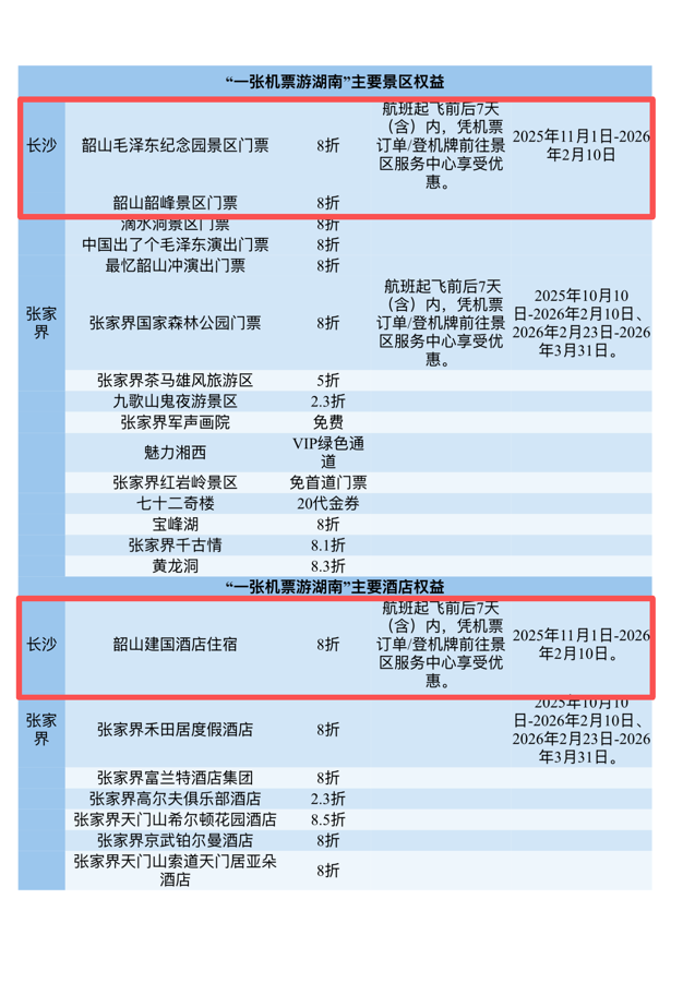 自2025年11月1日至2026年2月10日期间,旅客凭有效机票或登机牌,可在航班起飞前后7天(含)内,享受长沙、张家界、韶山三地核心景区、精品文旅演艺及精选酒店的专属优惠,产品涵盖韶旅集团旗下韶峰、韶山毛泽东纪念园、韶山建国酒店等项目。
