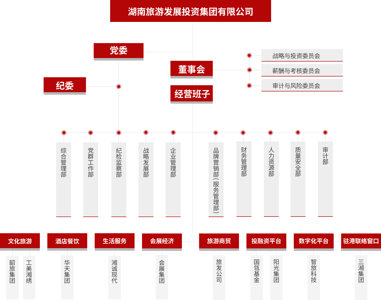 湖南旅游发展投资集团有限公司(简称“湖南旅游集团”)是湖南省委、省政府为实施全域旅游战略,于2022年7月批准成立的省管大型酒店旅游企业。集团注册资本100亿元,所属全资及控股子公司三湘集团、华天集团(股票代码:000428)、阳光集团、韶旅集团、旅发公司、湘诚现代、会展集团、智旅科技、国瓴基金、湘绣所、工美所等各级子企业80余家,拥有员工10000余人。