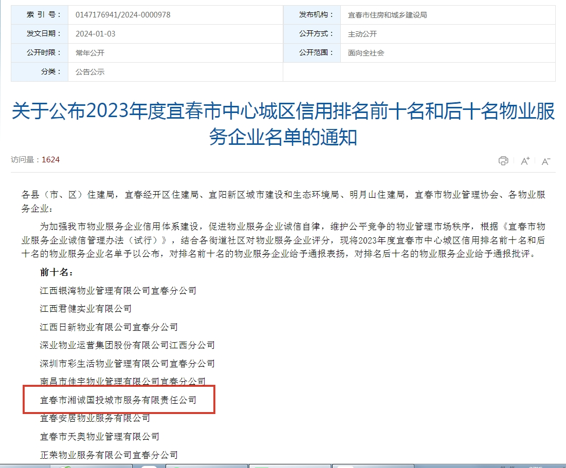 湘诚现代旗下宜春湘诚国投荣获“2023年度诚信服务企业”称号